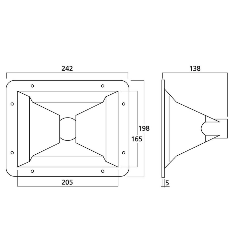 Tuba średnio-wysokotonowa od marki Monacor dedykowana do głośnika MRD-80. Jej wymiary to 242x198x138 mm, a waga to jedyne 270g.