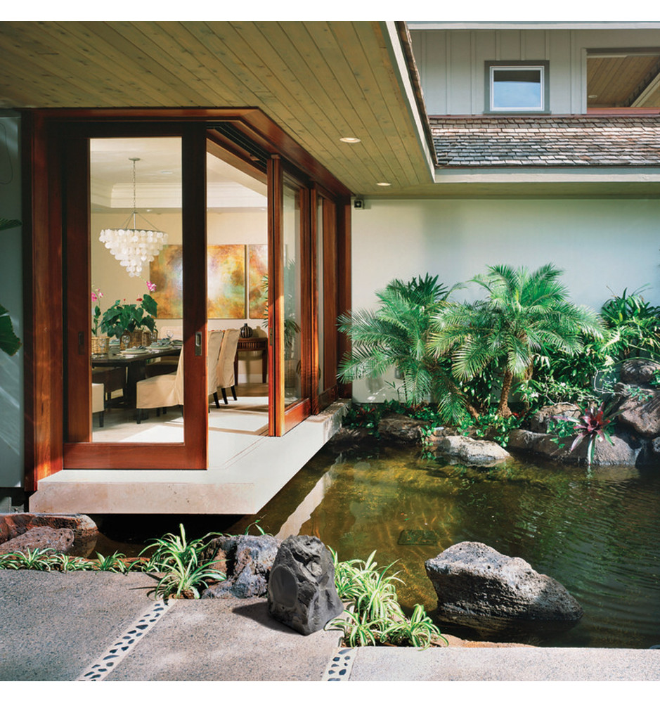 Obudowa całkowicie uszczelniona, wzmacniana i pokryta imitacją kamienia oraz grill stalowy odporny na promieniowanie UV i wodę, zapewniają ochronę w trudnych warunkach pogodowych. Głośnik ML-75R może być ustawiony na ziemi, w ogrodzie, wokół basenu, tarasu itp. Dzięki wyglądowi imitującemu kamień głośnik MartinLogan ML-75R dyskretnie wtapia się w otoczenie.