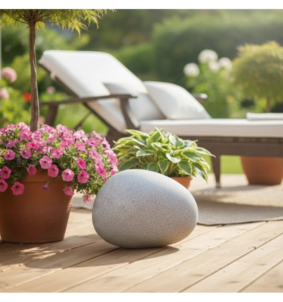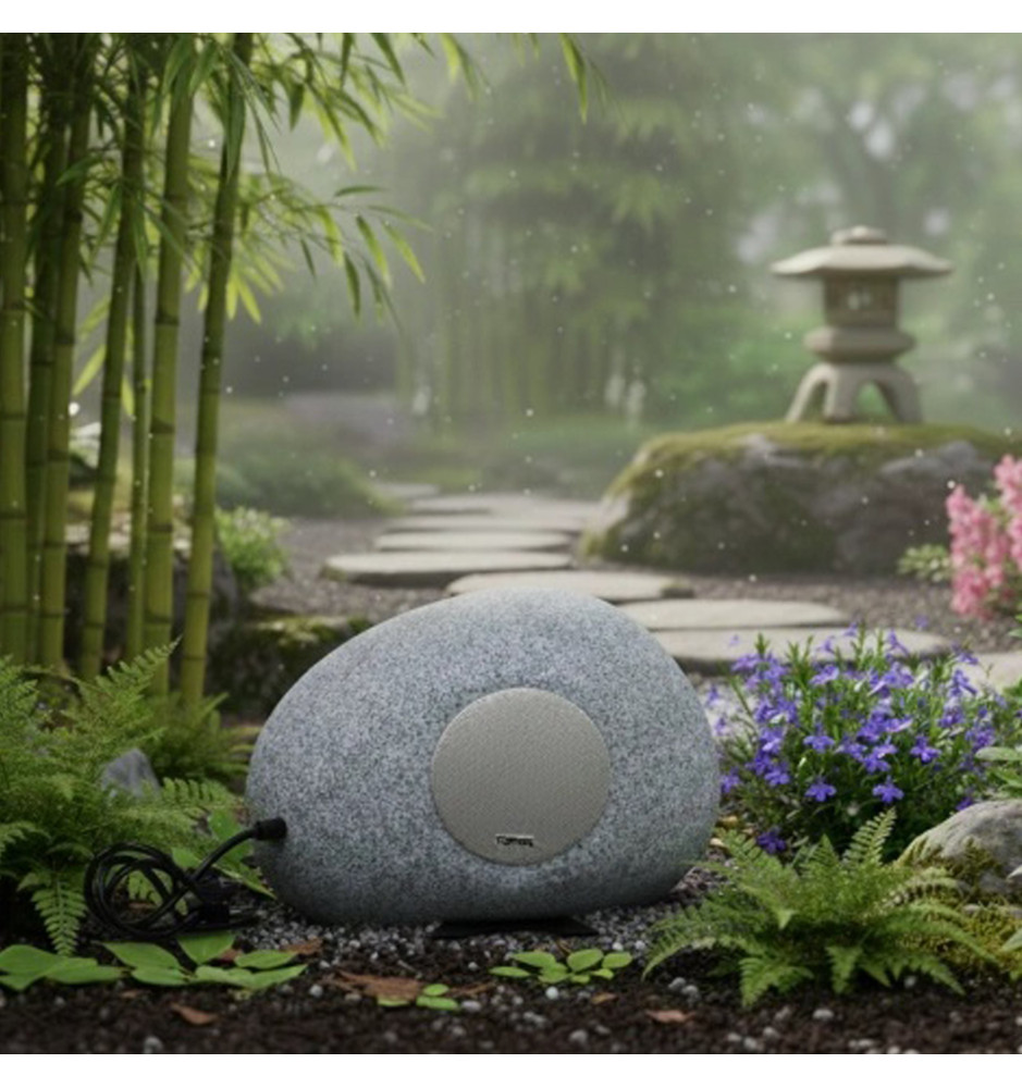 Obudowa głośnika wykonana w formie kamienia ogrodowego nie tylko prezentuje się naturalnie i estetycznie, ale także zapewnia odporność na warunki atmosferyczne. Dzięki temu muzyka towarzyszy Ci na zewnątrz niezależnie od pogody.
