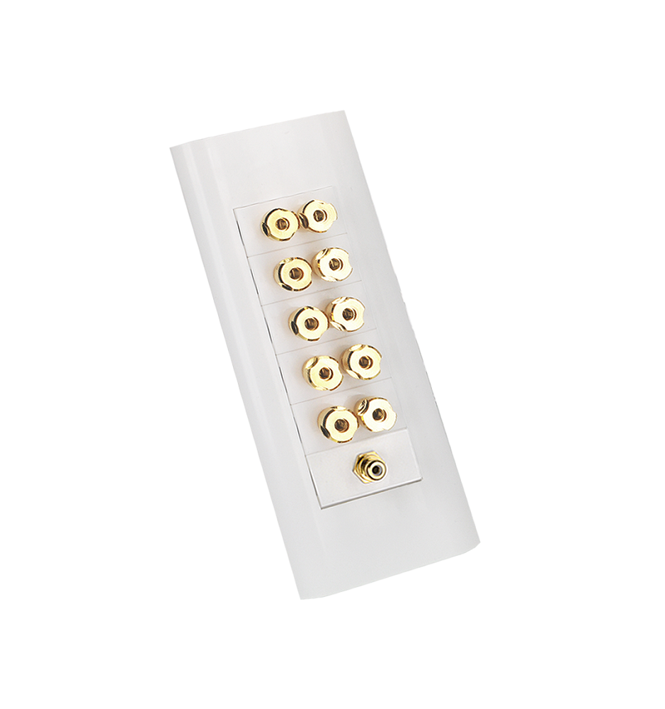 Zestaw Gniazdo do Kina Domowego 5.1 Multipanel został wyposażony w 6 paneli - 10x gniazd głośnikowych (bananowych)i jedno gniazdo 1 RCA do subwoofera. Komplet ten sprawdzi się idealnie przy podłączeniu zastawu 5.1, pozwalając na doprowadzenie sygnału z dowolnego miejsca w Twoim domu i wyprowadzenie go w estetyczny sposób ze ściany, podłogi lub bezpośrednio z mebla.