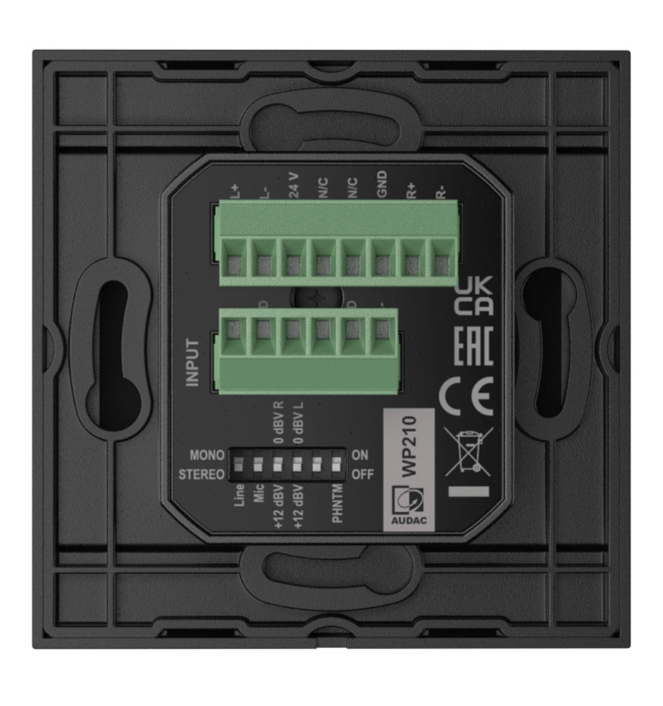 Audac WP210 to panel ścienny dedykowany do używania w połączeniu z aktywnym systemem głośników ARES5A. Odpowiada za konwersję sygnału liniowego pochodzącego np. z tunera czy przenośnego urządzenia mobilnego do poziomu odpowiadającego wejściu sygnału różnicowego w głośnikach. Na jego froncie umieszczono stereofoniczne wejście liniowe Jack 3,5 mm oraz zbalansowane wejście mikrofonowe XLR (oba wyposażone we własne pokrętło umożliwiające miksowanie sygnałów).