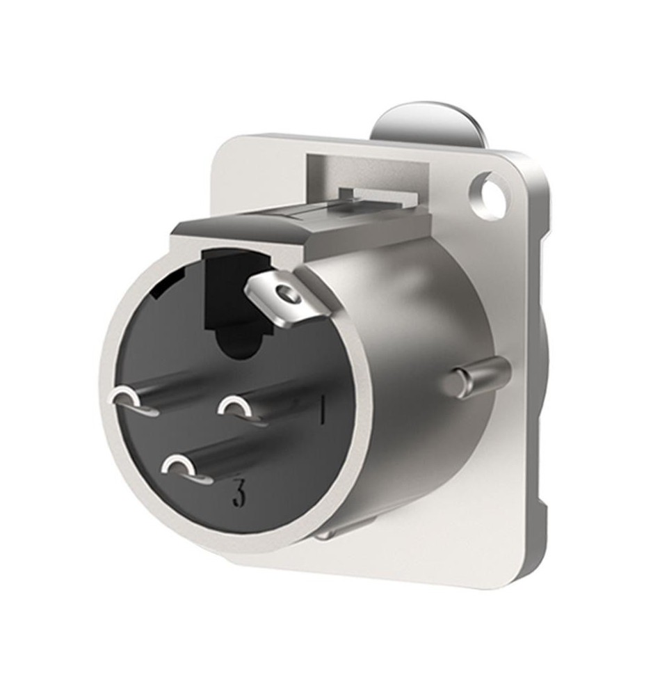3-pinowe gniazdo panelowe XLR żeńskie o wytrzymałej konstrukcji z powłoką ze stopu cynku. Jego ergonomiczna budowa gwarantuje bezpieczeństwo, trwałość i niezawodność.