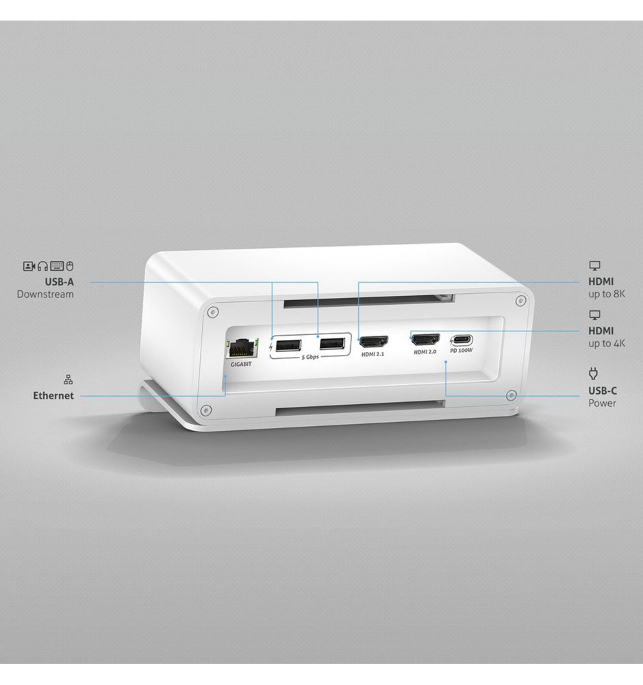 Wyposażona została w dwa wyjścia HDMI zdolne do pracy w trybie single screen 8K/5K lub dual screen 4K, port Ethernet RJ45, dwa porty USB typu A, wyjście USB typu C oraz port USB Power Delivery do 100W.