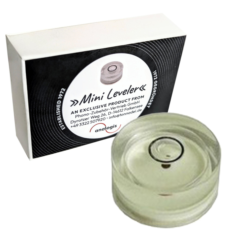 Miniaturowa poziomica wykonana z akrylu o średnicy zaledwie 17 milimetrów, służąca do idealnego wypoziomowania gramofonu lub innych urządzeń Hi-Fi.
