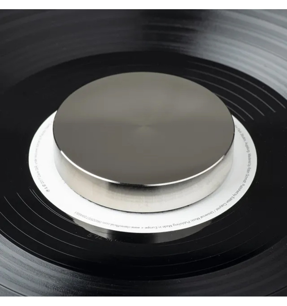 Wykonany z niklowanego aluminium docisk (stabilizator) do płyt winylowych, zapewniający bezpieczne dopasowanie płyty do powierzchni talerza gramofonu. Dzięki stosunkowo niewielkiej wadze 190g stanowi idealny wybór do mniejszych gramofonów, nie powodując nadmiernego obciążenia talerza, które mogłoby powodować niepożądane dudnienie. Umieszczona od spodu podkładka filcowa chroni etykietę płyty podczas odtwarzania.