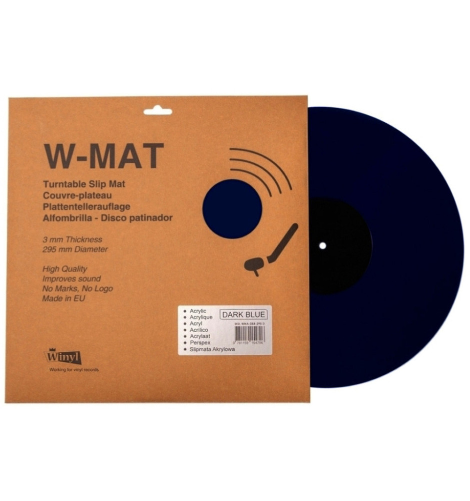 W-Mat Acrylic Dark Blue hiszpańskiej marki Winyl to slipmata gramofonowa wykonana w 100% ze sztywnego polimeru akrylowego wykończonego na połysk. Posiada doskonałe właściwości tłumiące i antyelektrostatyczne, dzięki czemu pozwala zniwelować niepożądane rezonanse i zakłócenia podczas odtwarzania.