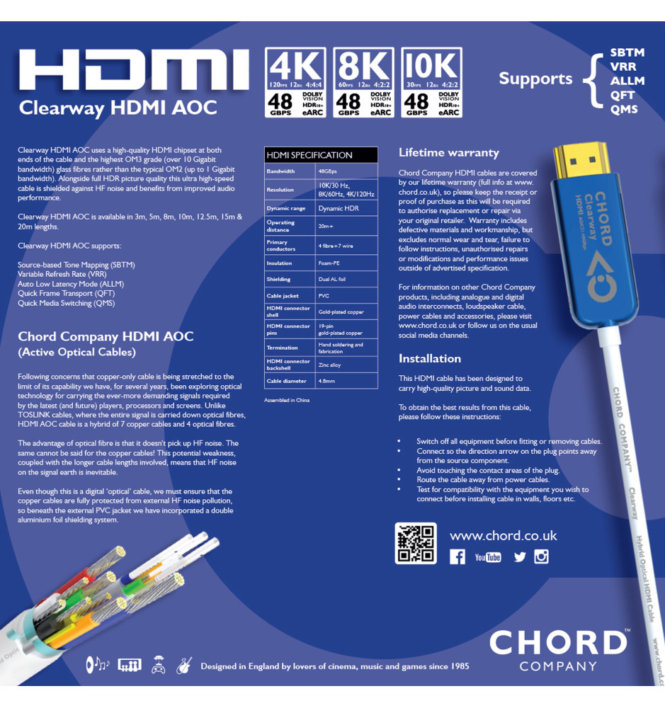 Chord Company Clearway HDMI AOC - Aktywny kabel optyczny HDMI 2.1 8K/60Hz 4K/120Hz 48Gbps 20m