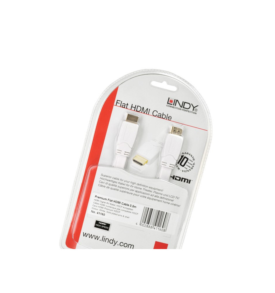 Przewód HDMI Lindy posiada specjalnie skonstruowane, płaskie wtyki, które zwiększają wygodę użytkowania. Biała obudowa wtyków oraz osłona przewodu idealnie pasuje do jasnego, nowoczesnego wnętrza i białego sprzętu AV.