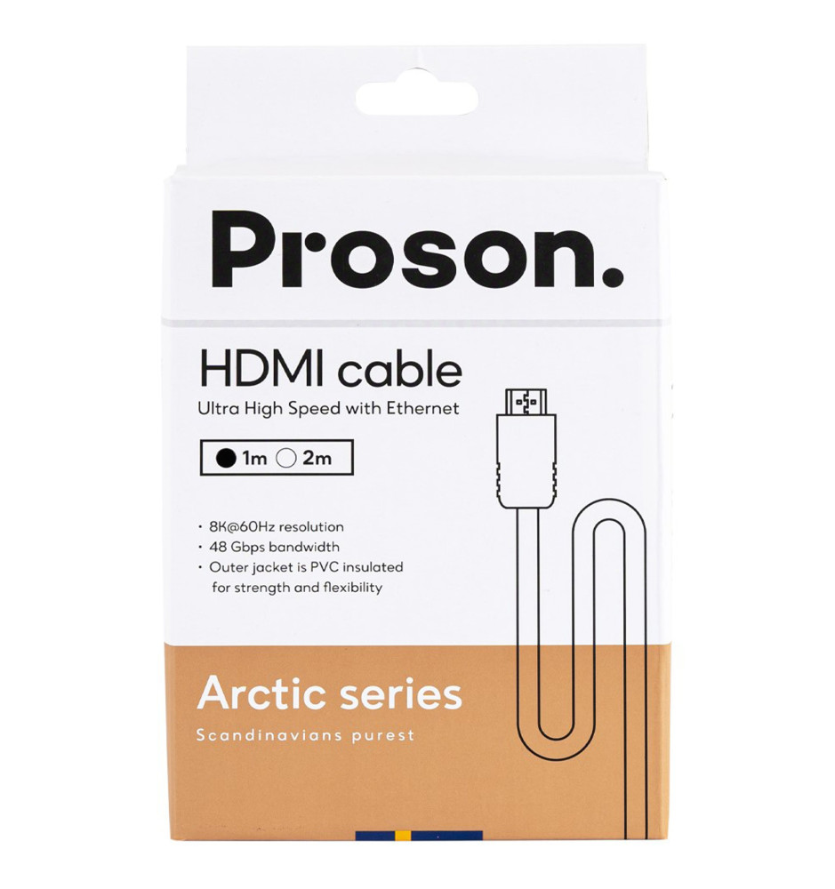 Stylowy kabel HDMI w standardzie HDMI 2.1 Ultra High Speed z Ethernet z nowej serii Arctic Series od szwedzkiej marki Proson, oferujący szybką transmisję danych z prędkością do 48 Gbps oraz obsługę rozdzielczości do 8K przy 60Hz z HDR.