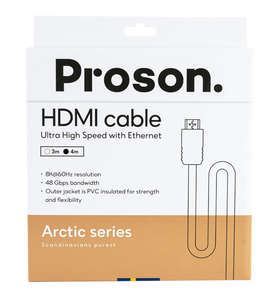 Stylowy kabel HDMI w standardzie HDMI 2.1 Ultra High Speed z Ethernet z nowej serii Arctic Series od szwedzkiej marki Proson, oferujący szybką transmisję danych z prędkością do 48 Gbps oraz obsługę rozdzielczości do 8K przy 60Hz z HDR.