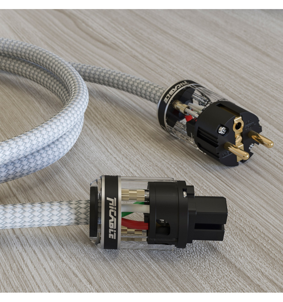 Przewód zasilający Ricable Primus Power wyposażony jest w wysokiej jakości wtyki IEC 10A oraz Schuko 16A z pozłacanymi 24-karatowym złotem stykami. Precyzyjne wykonanie oraz optymalna izolacja wewnętrzna zapewniają doskonały kontakt i minimalizują straty sygnału.