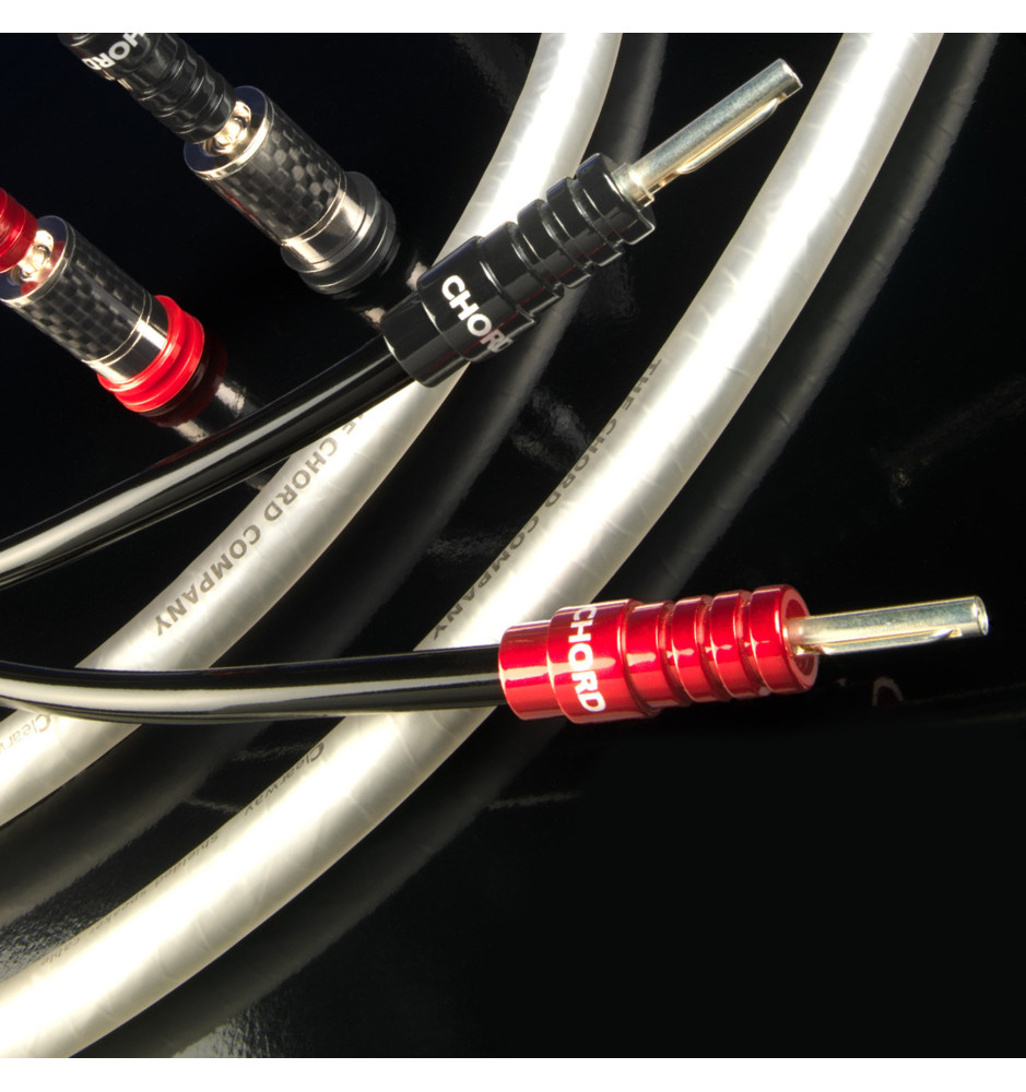 Zestaw dwóch najwyższej jakości kabli głośnikowych ClearwayX od Chord Company, konfekcjonowanych doskonałymi wtykami bananowymi ChordOhmic.