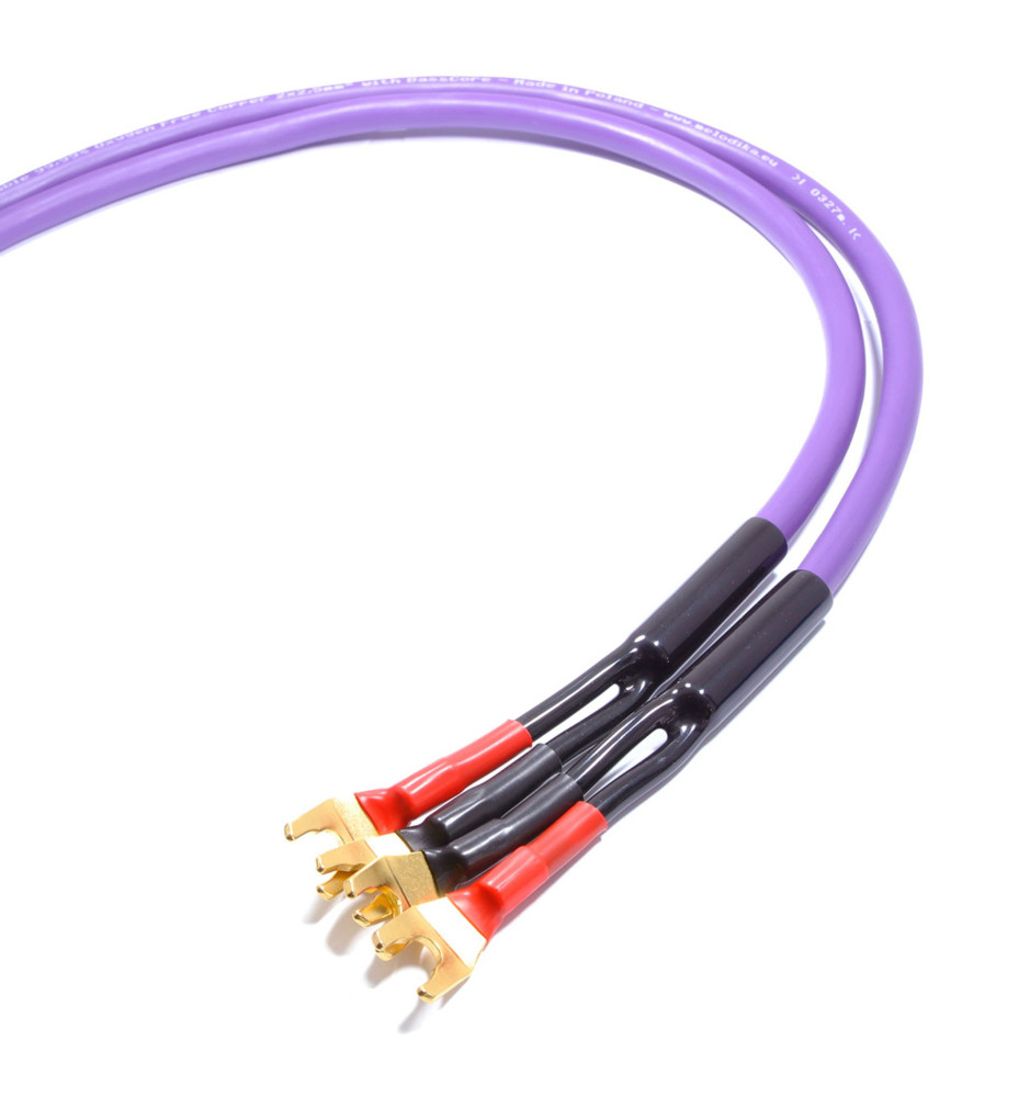 Zestaw dwóch wysokiej jakości kabli głośnikowych konfekcjonowanych wtykami widełkowymi.