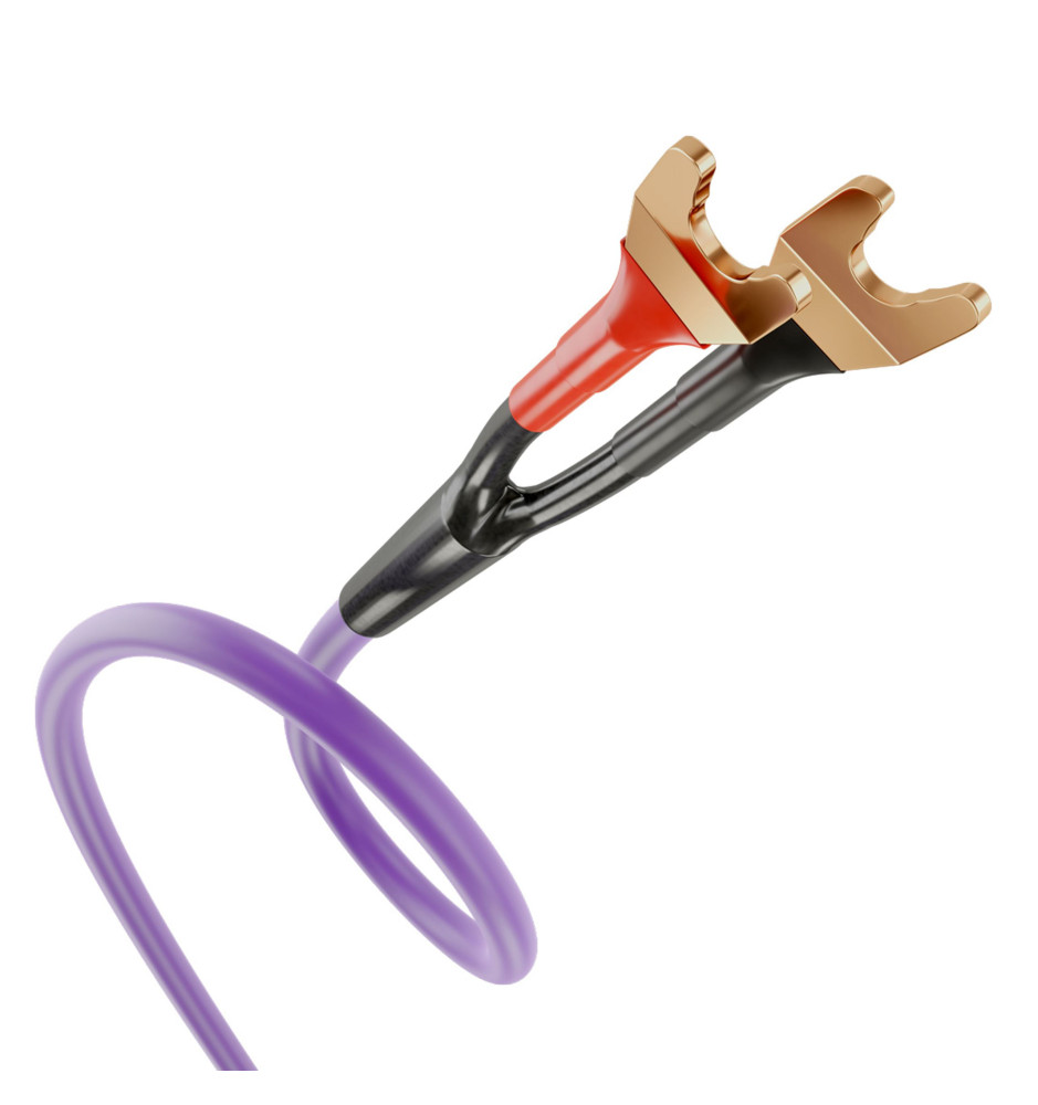 Zestaw dwóch wysokiej jakości kabli głośnikowych konfekcjonowanych wtykami widełkowymi.
