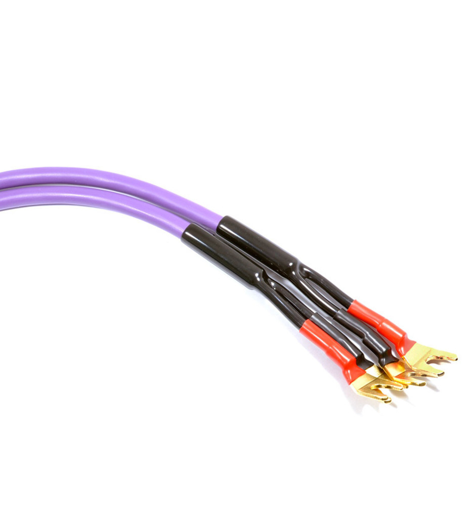 Zestaw dwóch wysokiej jakości kabli głośnikowych konfekcjonowanych wtykami widełkowymi.