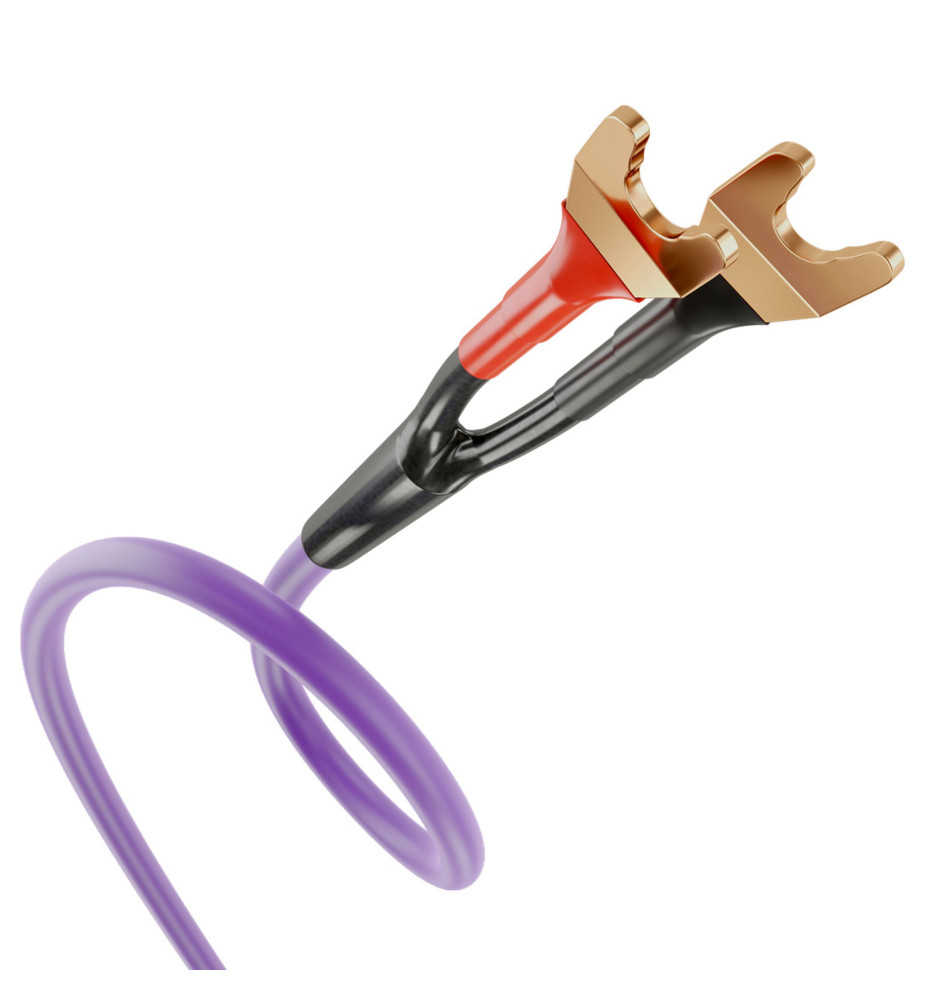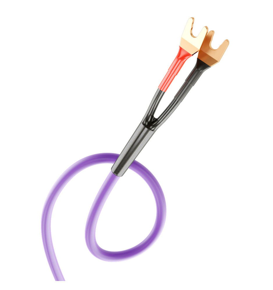 Zestaw dwóch wysokiej jakości kabli głośnikowych konfekcjonowanych wtykami widełkowymi.