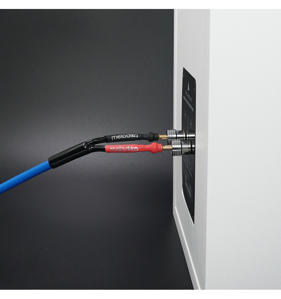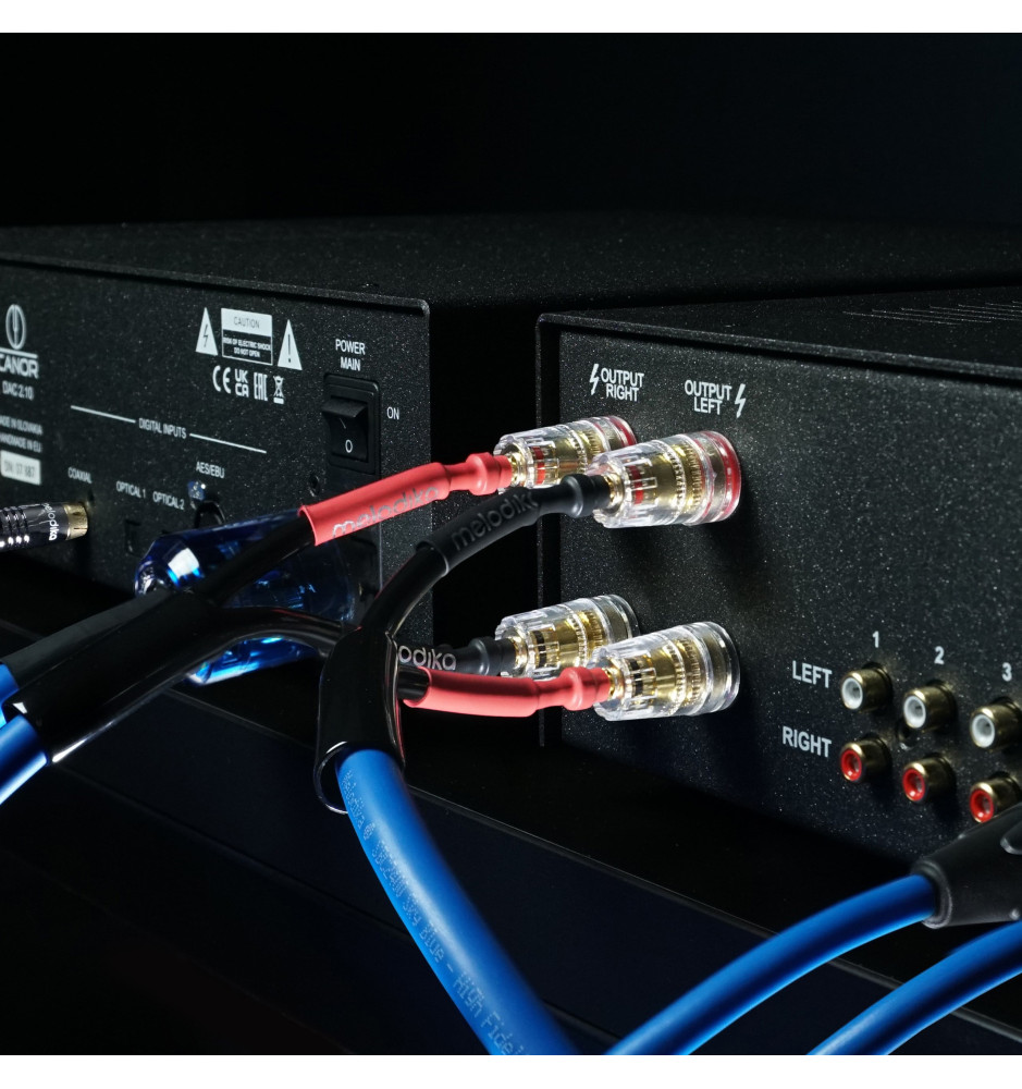 Zestaw dwóch wysokiej jakości kabli głośnikowych z najnowszej serii Sky Blue, wykonanych z miedzi beztlenowej OFC 99,99% klasy 4N o przekroju 2x1,5mm² i konfekcjonowanych pozłacanymi wtykami bananowymi z wykorzystaniem technologii Solid Grip.
