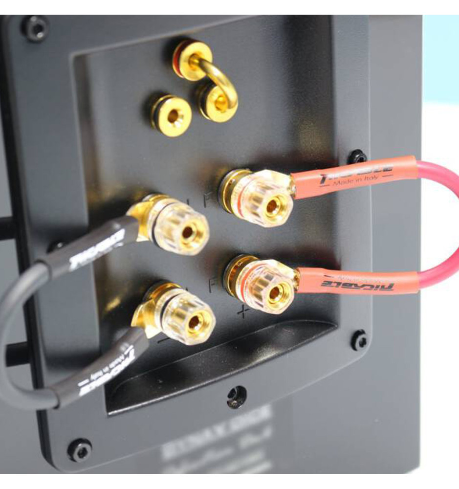 Zestaw 4 sztuk najwyższej jakości zworek do kolumn głośnikowych, ręcznie wykonanych we Włoszech na bazie przewodu Ricable Dedalus Speaker MKII i zakończonych z obu stron wtykiem typu widełki.