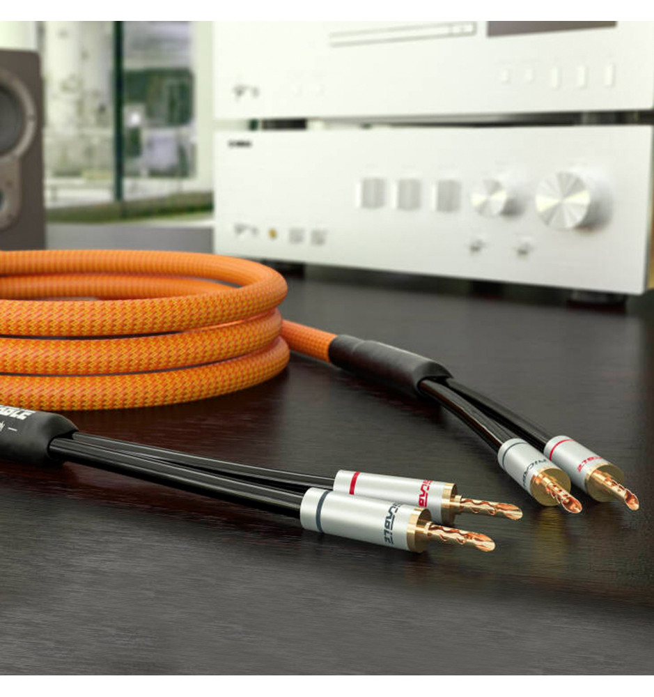 Komplet dwóch ręcznie wyprodukowanych we Włoszech i konfekcjonowanych pozłacanymi wtykami bananowymi BFA, podwójnie ekranowanych kabli głośnikowych klasy High-End z technologią redukcji szumów, które gwarantują niezwykle wierne i naturalne brzmienie.