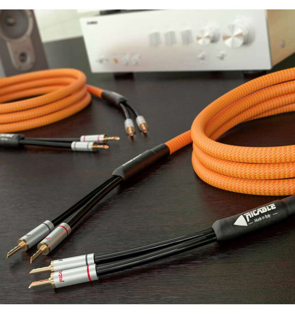 Komplet dwóch ręcznie wyprodukowanych we Włoszech i konfekcjonowanych pozłacanymi wtykami bananowymi BFA, podwójnie ekranowanych kabli głośnikowych klasy High-End z technologią redukcji szumów, które gwarantują niezwykle wierne i naturalne brzmienie.