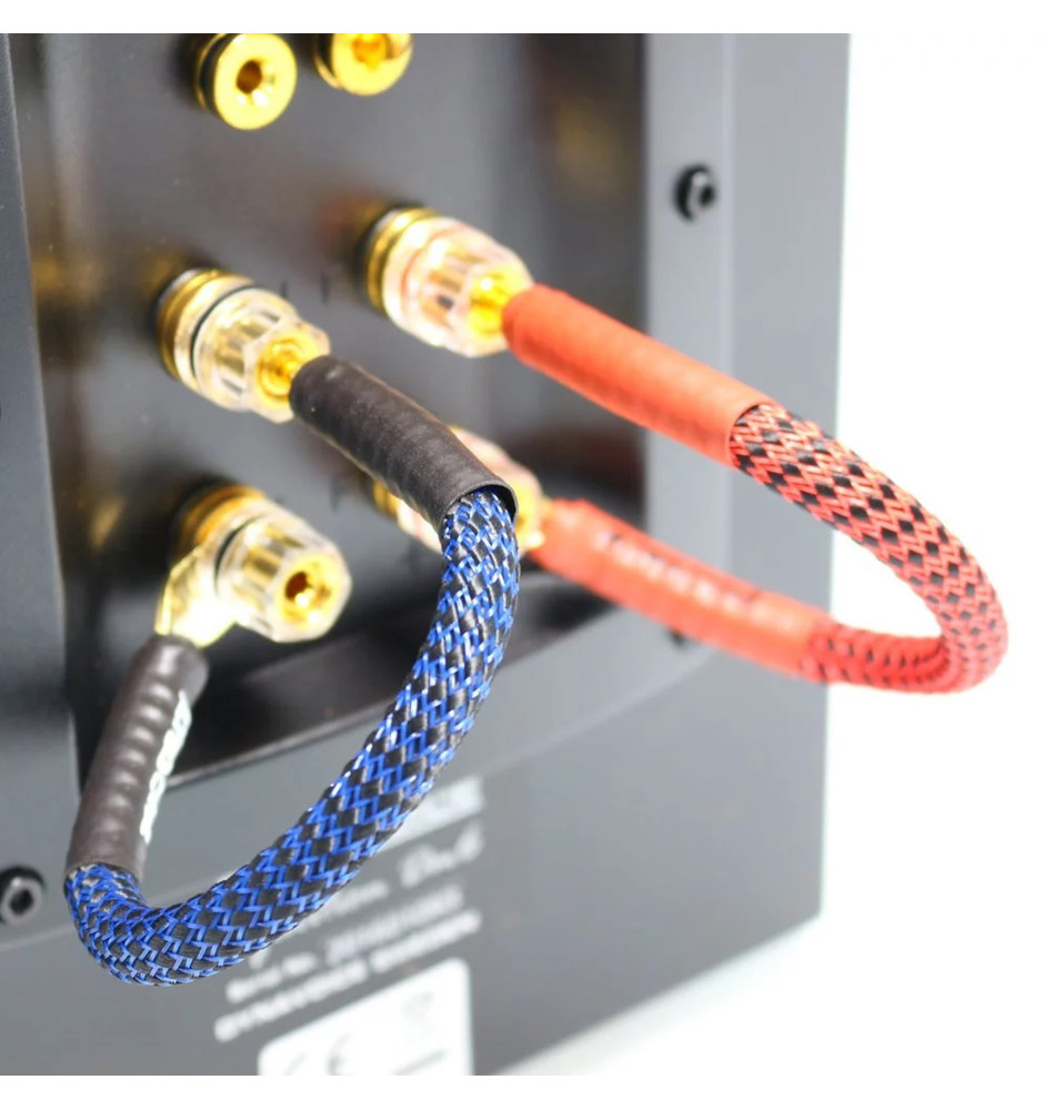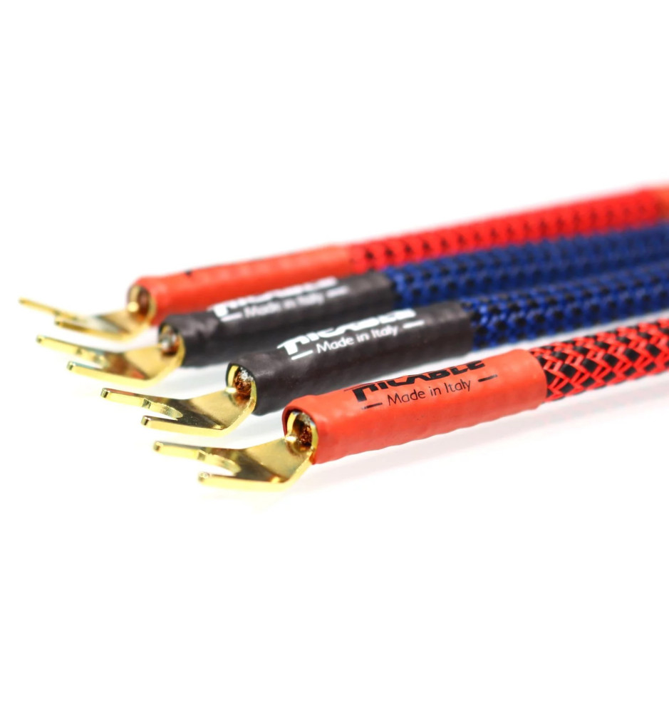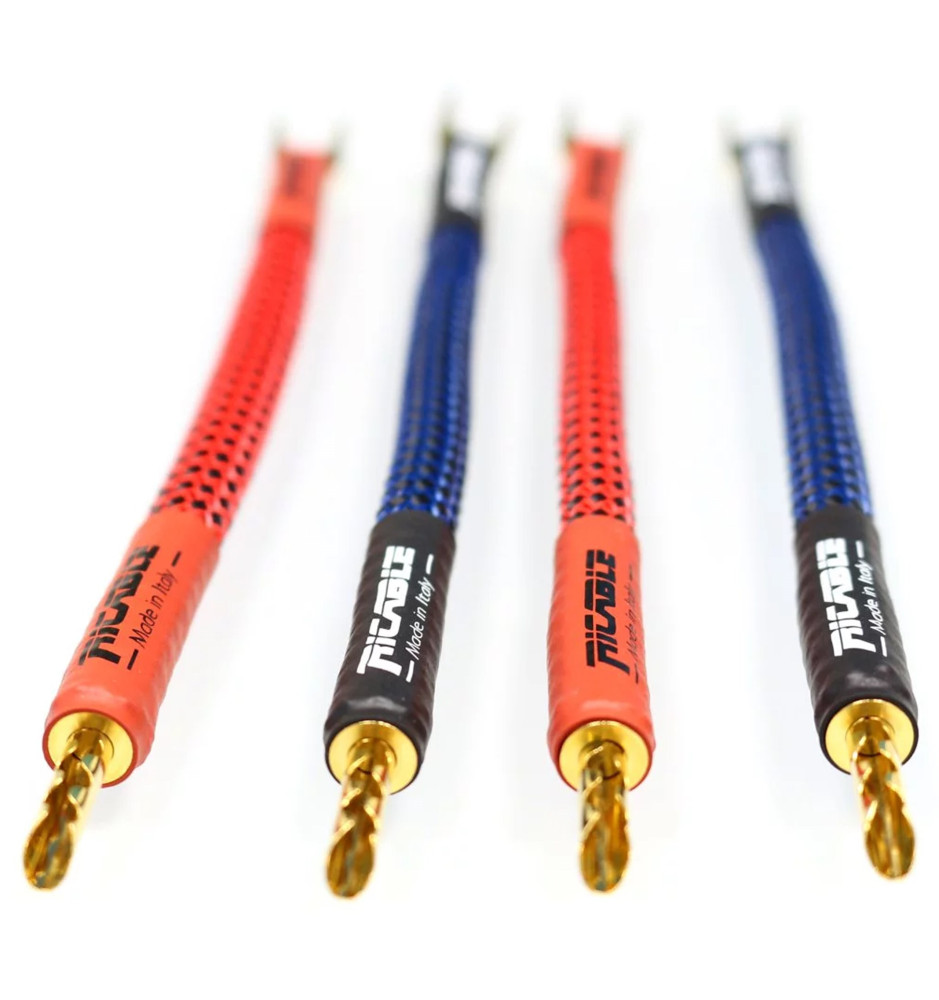 Zestaw 4 sztuk zworek klasy Hi-End do kolumn głośnikowych, ręcznie wykonanych we Włoszech na bazie przewodu Ricable Invictus Speaker Reference i zakończonych z jednej strony wtykiem bananowym, a z drugiej wtykiem typu widełki.