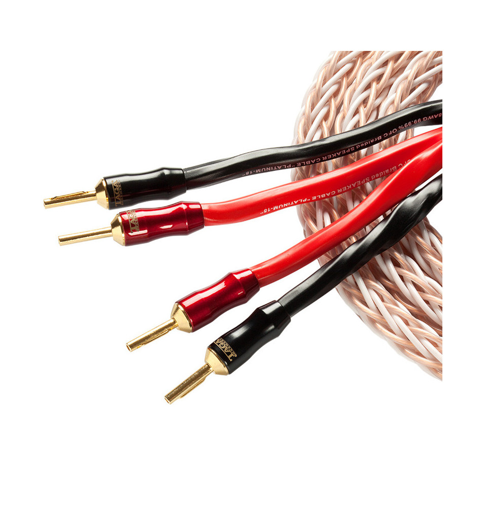 Zestaw dwóch wysokiej klasy kabli głośnikowych Taga Harmony PLATINUM-18-16C o długości 3m. PLATINUM-18-16C jest plecionką wielożyłową wykonaną z czystej miedzi beztlenowej OFC 99.99% zakończoną wysokiej jakości wtykami bananowymi z pozłacanej miedzi.