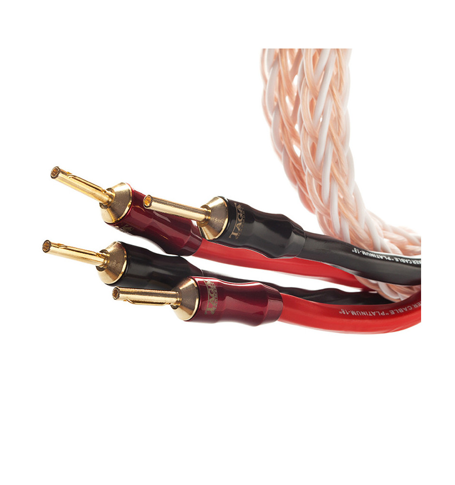 Zestaw dwóch wysokiej klasy kabli głośnikowych Taga Harmony PLATINUM-18-16C o długości 3m. PLATINUM-18-16C jest plecionką wielożyłową o 16 żyłach 1,2mm wykonaną z czystej miedzi beztlenowej OFC 99.99% zakończoną wysokiej jakości wtykami bananowymi z pozłacanej miedzi.