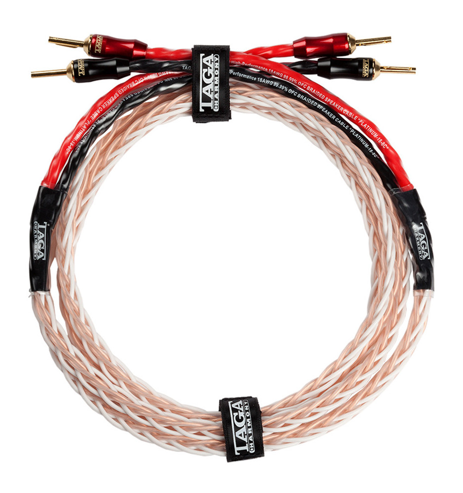Zestaw dwóch doskonałej jakości kabli głośnikowych Taga Harmony PLATINUM-18-8C o długości 3m. PLATINUM-18-8C jest plecionką wielożyłową o 8 żyłach 1,2mm wykonaną z czystej miedzi beztlenowej OFC 99.99% zakończoną wysokiej jakości wtykami bananowymi z pozłacanej miedzi.