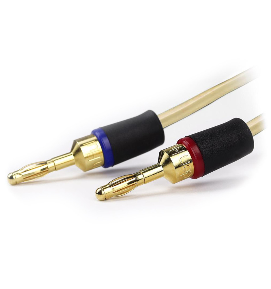 Komplet fabrycznie konfekcjonowanych pozłacanymi wtykami bananowymi kabli głośnikowych, dedykowanych do podłączenia pary kolumn głośnikowych.