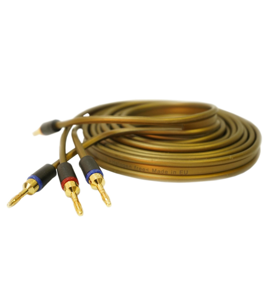 Komplet fabrycznie konfekcjonowanych pozłacanymi wtykami bananowymi kabli głośnikowych, dedykowanych do podłączenia pary kolumn głośnikowych.