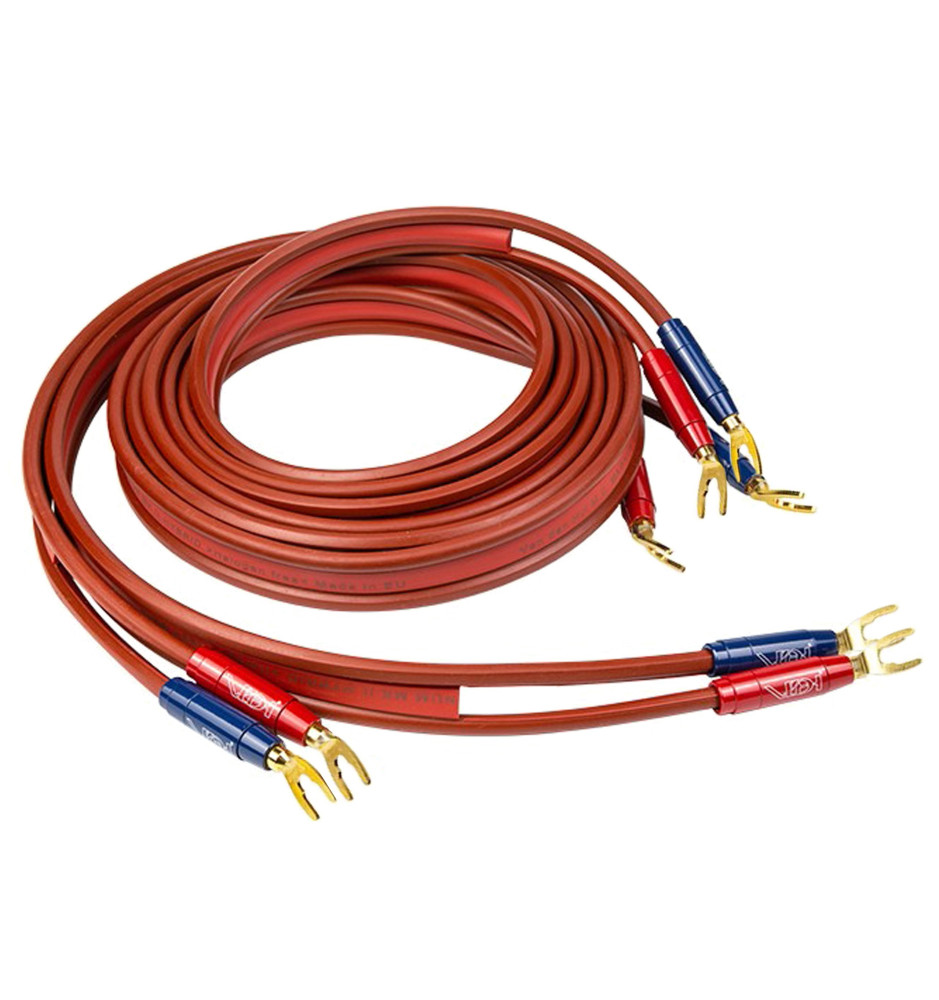 Komplet fabrycznie konfekcjonowanych pozłacanymi wtykami widełkowymi nowej wersji MK II dwużyłowych kabli głośnikowych o atrakcyjnym, ciemno-czerwonym matowym płaszczu zewnętrznym zaprojektowanych, aby zapewnić najwyższą jakość transmisji sygnału.