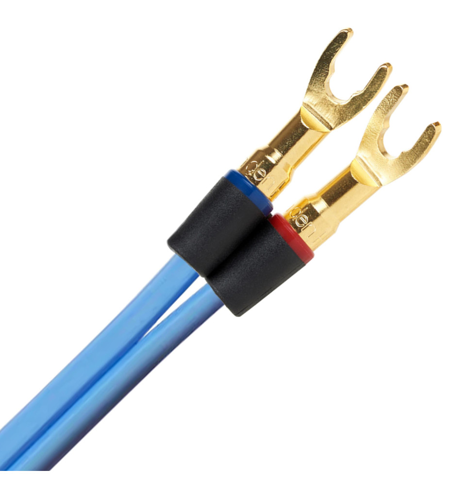 Komplet fabrycznie konfekcjonowanych pozłacanymi wtykami widełkowymi kabli głośnikowych, dedykowanych do podłączenia pary kolumn głośnikowych.