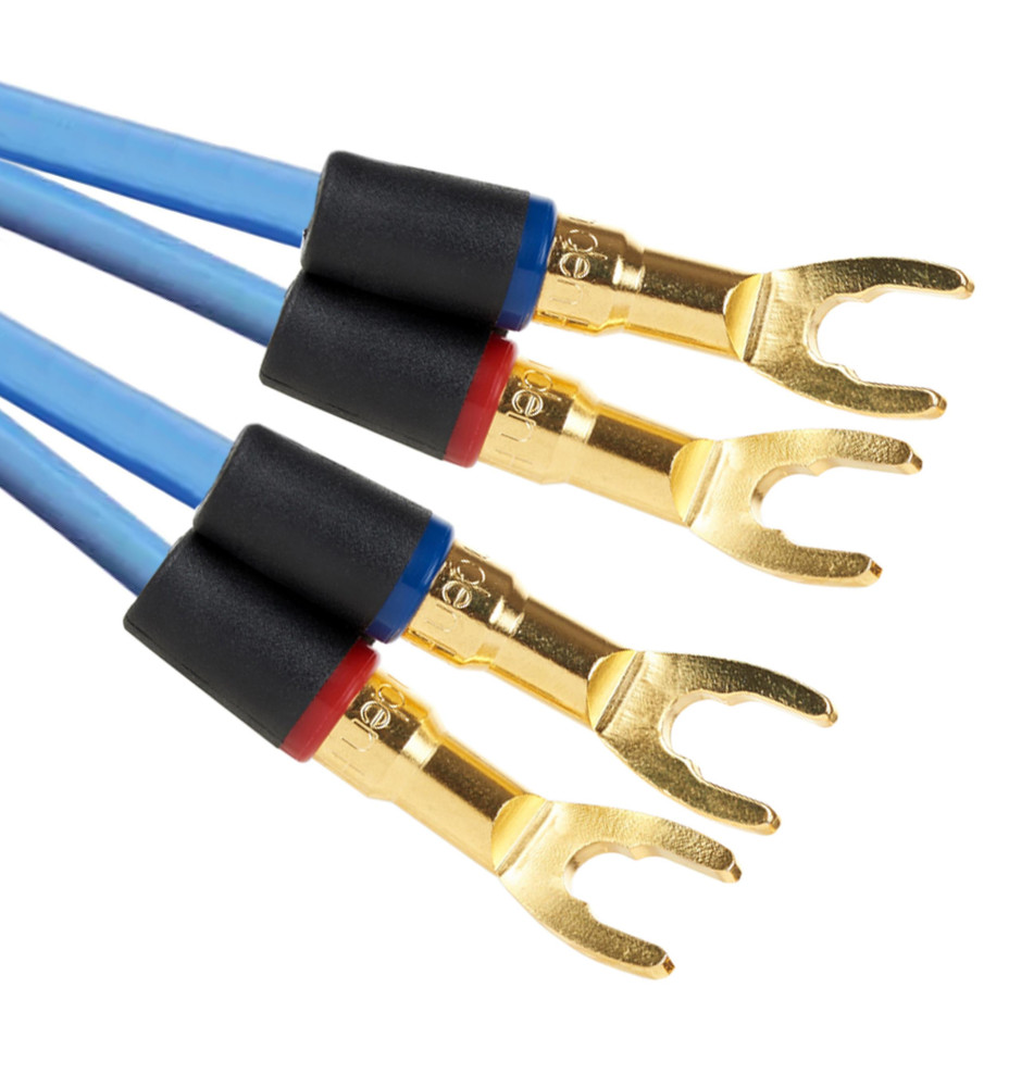 Komplet fabrycznie konfekcjonowanych pozłacanymi wtykami widełkowymi kabli głośnikowych, dedykowanych do podłączenia pary kolumn głośnikowych.