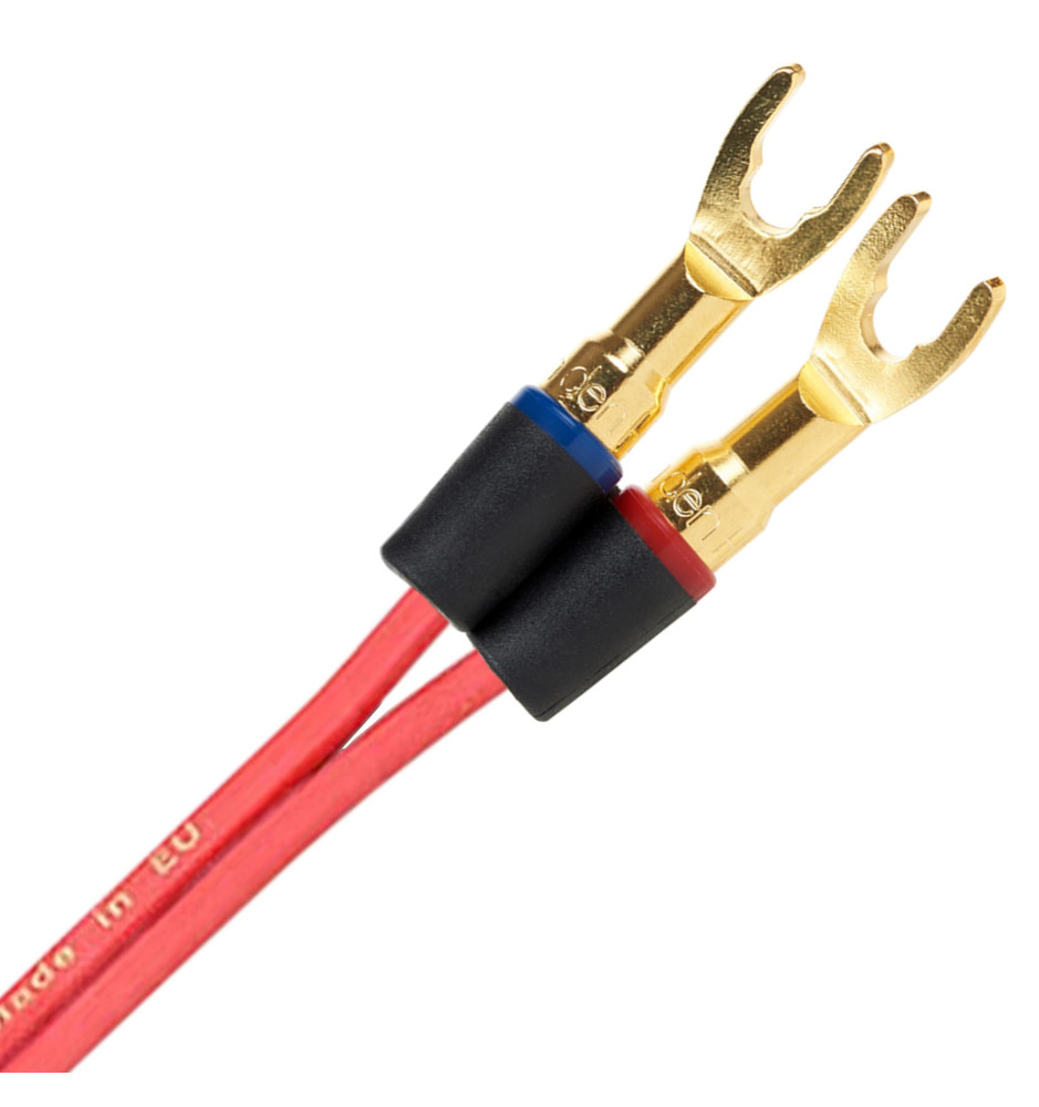 Komplet fabrycznie konfekcjonowanych pozłacanymi wtykami widełkowymi kabli głośnikowych, dedykowanych do podłączenia pary kolumn głośnikowych.