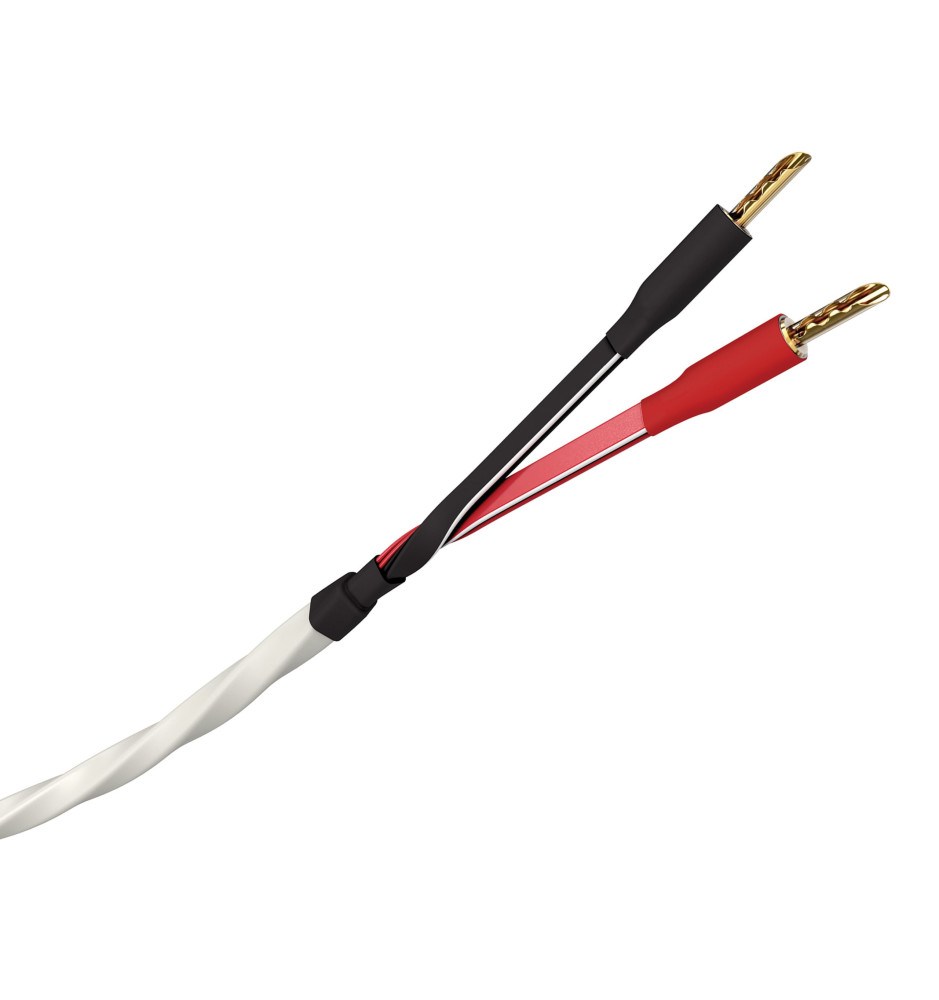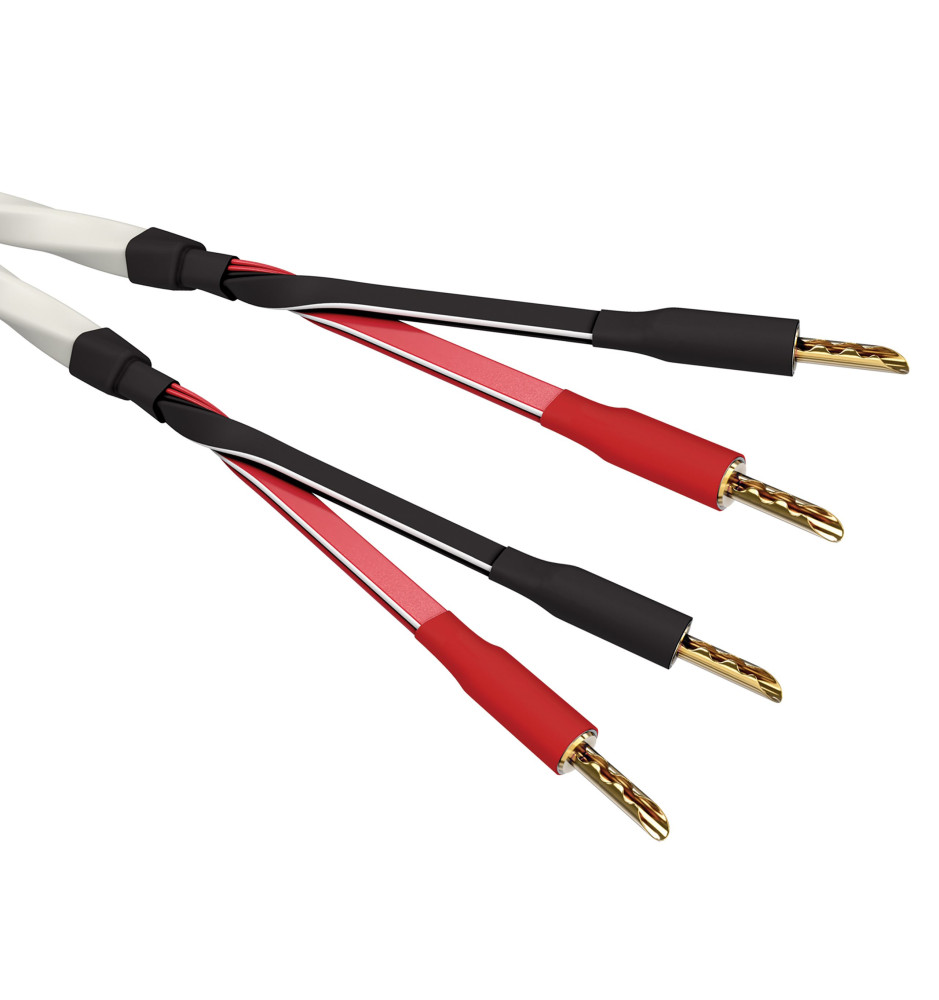 Komplet dwóch konfekcjonowanych pozłacanymi wtykami bananowymi, innowacyjnych przewodów głośnikowych o opatentowanej konstrukcji Quad DNA Helix®, wykorzystującej przewodniki z miedzi beztlenowej OFC oraz ultra-cichą izolację Composilex® 5.