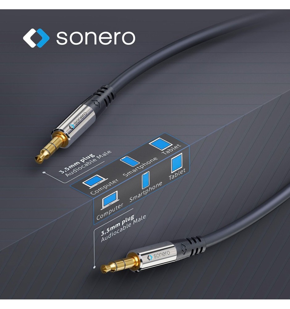 Kabel Sonero SAC500 został specjalnie zaprojektowany do łączenia urządzeń stereo audio, takich jak słuchawki, smartfony czy odtwarzacze MP3. Jego wtyki 3,5mm Jack z chromowanymi aluminiowymi obudowami oraz pozłacanymi stykami zapewniają idealne dopasowanie, optymalne połączenie, maksymalną jakość transmisji dźwięku oraz wysoką odporność przed korozją.