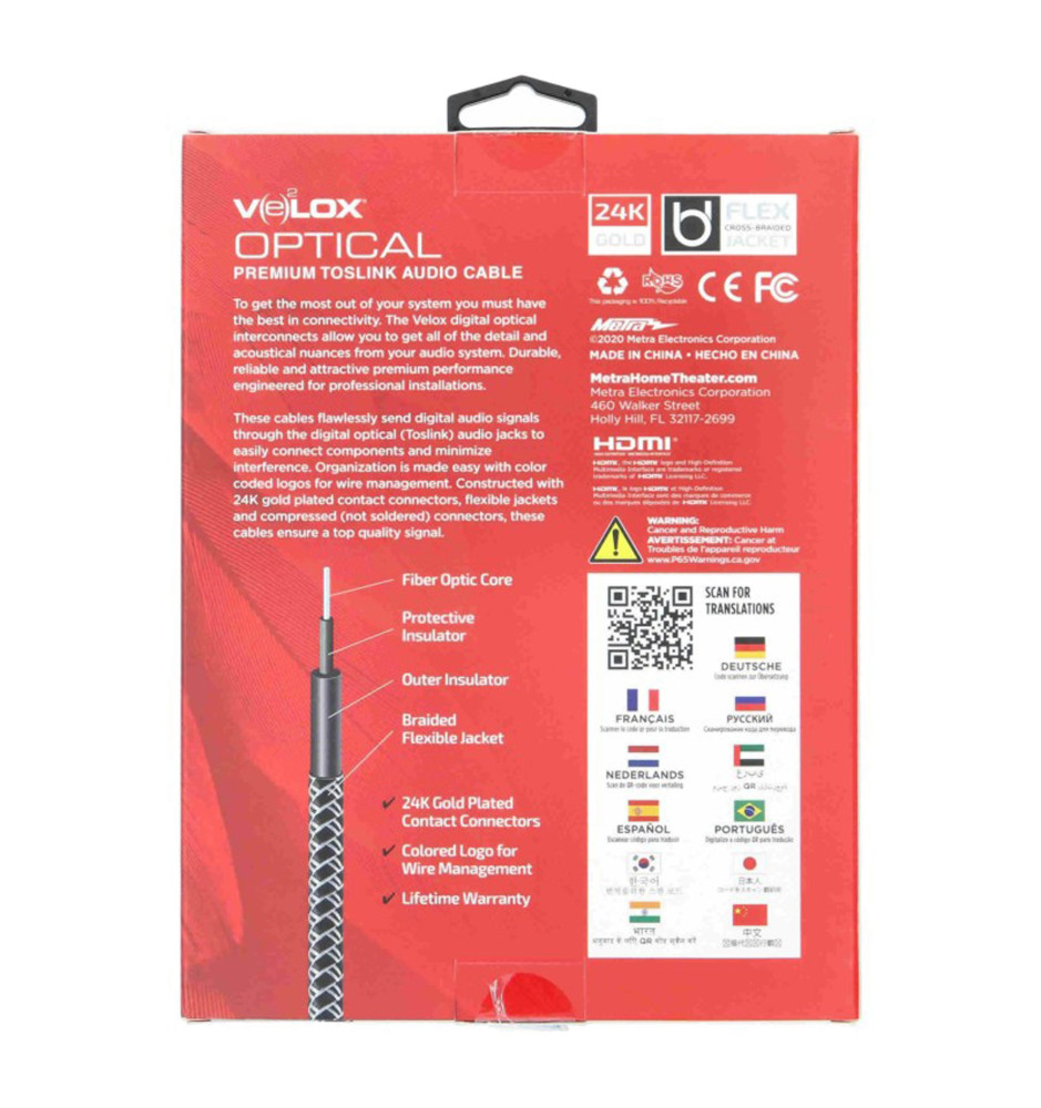 Konstrukcja przewodów z serii Velox została oparta o bardzo dobrej jakości włókna optyczne z pozłacanymi 24-karatowym złotem, polerowanymi zakończeniami. W efekcie sygnał jest niezwykle czysty i bezstratny. Otulina z PCV zabezpieczona dodatkowym oplotem bawełnianym chroni rdzeń przewodu przed złamaniami.