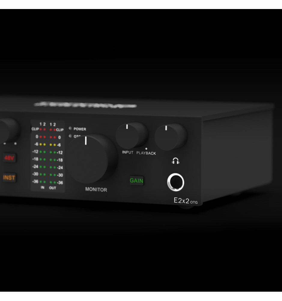 Interfejs E2x2 OTG został wyposażony w autorski, ultra-linearny moduł przedwzmacniacza mikrofonowego o niezwykle niskim poziomie szumów. Dzięki niemu możliwe jest szczegółowe i czyste rejestrowanie dźwięku, nawet przy maksymalnej głośności, bez słyszalnego szumu tła. Przełącznik zasilania Phantom 48V sprawia, że interfejs może współpracować z mikrofonami dynamicznymi oraz pojemnościowymi.