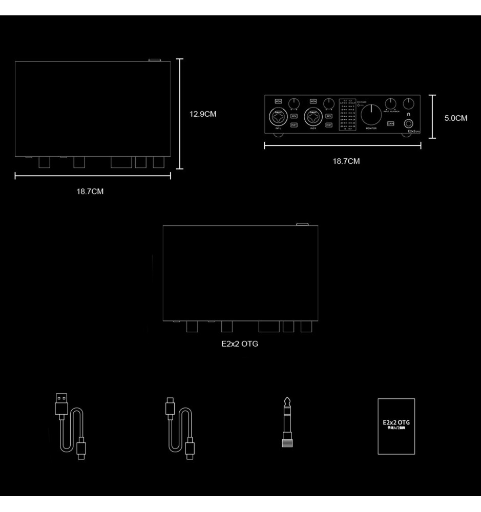 E2x2 OTG posiada wbudowany wzmacniacz słuchawkowy oparty o moduły NFCA-LE, złącze OTG dedykowane dla urządzeń mobilnych, dwa niezależne wejścia typu combo XLR/Jack dla mikrofonów lub instrumentów, dodatkowe cyfrowe wyjście optyczne, analogowe wyjście AUX oraz oferuje możliwość bezpośredniego monitoringu bez opóźnień.