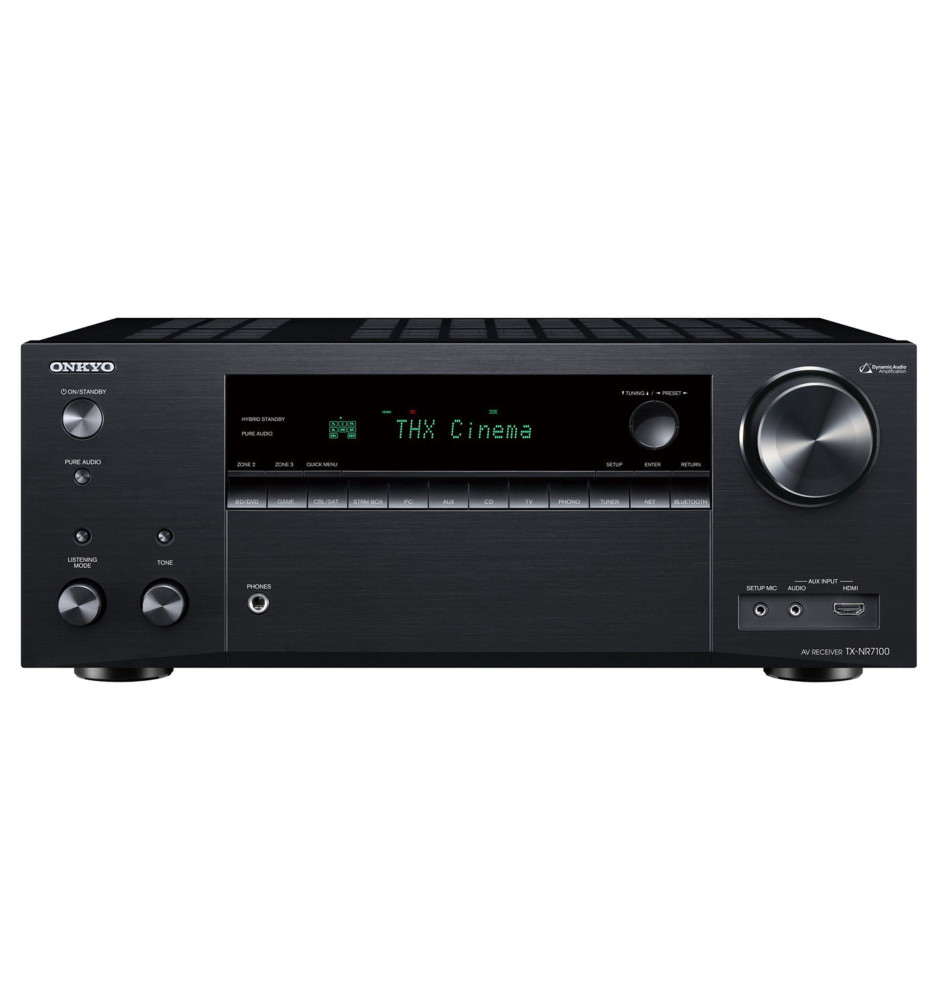 Onkyo TX-NR7100 to nagrodzony certyfikatem THX® Select, potężny, 9.2-kanałowy amplituner kina domowego z dynamicznym wzmocnieniem dźwięku DAA, obsługą dźwięku przestrzennego 3D oraz drugą strefą. Zapewnia prawdziwie kinową jakość obrazu oraz doskonały dźwięk podczas gier wideo, filmów, programów telewizyjnych czy strumieniowania Hi-Res Audio.
