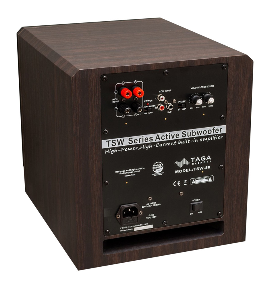 Kompaktowy subwoofer aktywny ze szczelinowym portem bassreflex umieszczonym z tyłu i wbudowanym wysokoprądowym wzmacniaczem klasy A/B napędzającym 8-calowy głośnik niskotonowy z papierową membraną. Zapewnia on mocne, głębokie i doskonale zdefiniowane basy oraz wspaniałą dynamikę niespotykaną w tym przedziale cenowym.