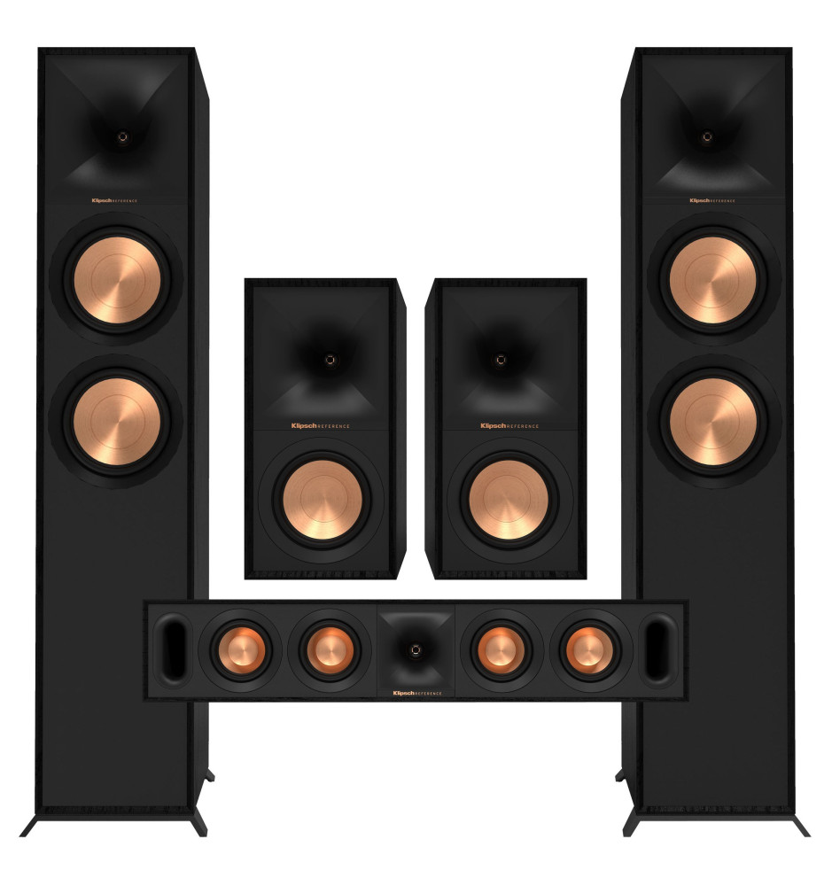 Kompletny zestaw czarnych kolumn głośnikowych marki Klipsch z serii New Reference Base, dedykowany do systemów kina domowego 5.0. W zestawie znajdują się dwie kolumny podłogowe Klipsch R-600F, dwie kolumny podstawkowe Klipsch R-50M oraz kolumna centralna Klipsch R-30C.