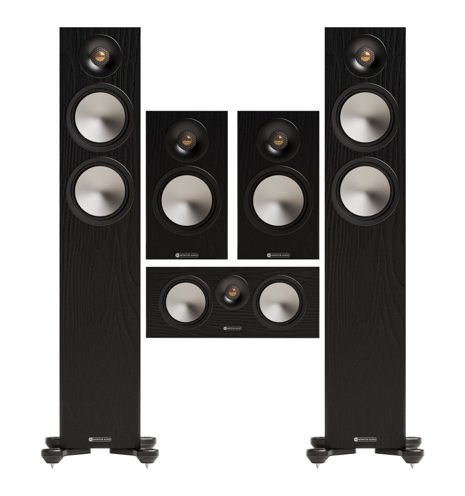 Kompletny zestaw kolumn głośnikowych do kina domowego 5.0 od Monitor Audio z serii Bronze, składający się z pary podłogowych kolumn głośnikowych Bronze 300, pary kolumn podstawkowych Bronze 50 oraz kolumny centralnej Bronze Centre.