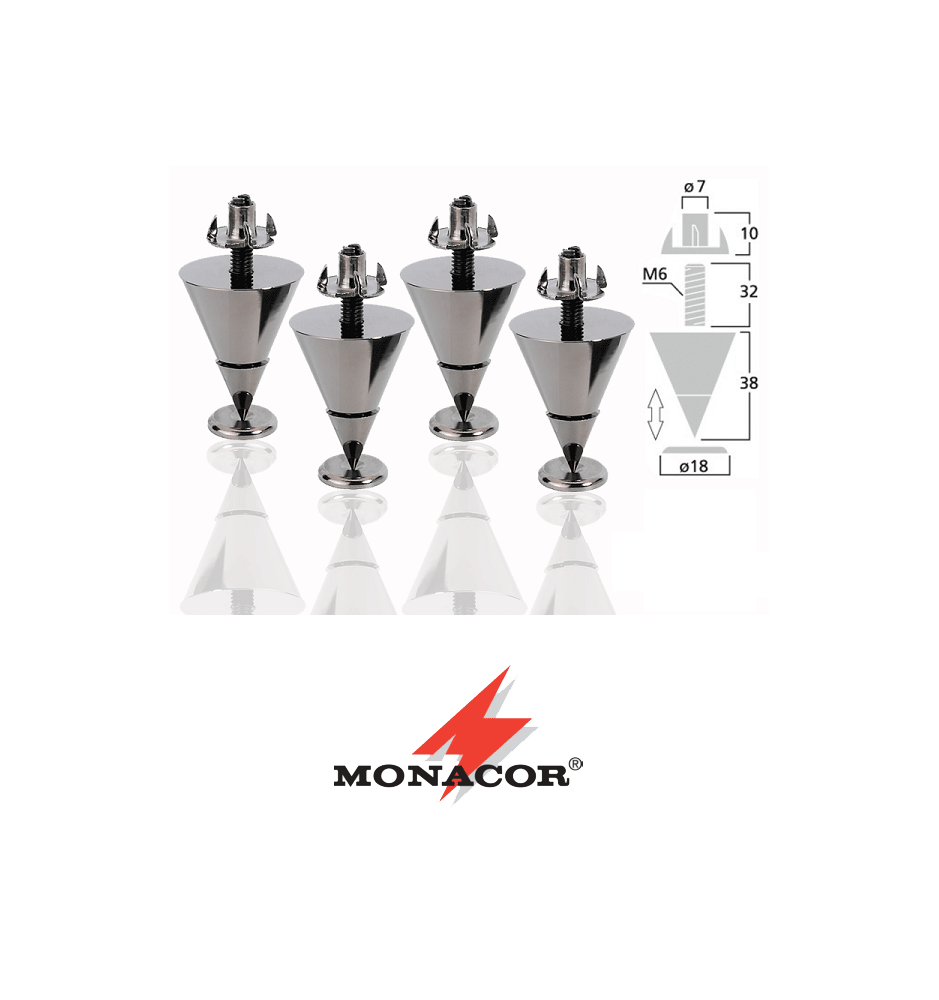 Każdy system audio zyska znacznie dzięki zainstalowaniu kolców Monacor. Z jednej strony zniwelują one drgania przenoszone na podłoże co poprawi osiągi zestawu, a z drugiej nadadzą szczególnego, dizajnerskiego stylu i profesjonalnego wyglądu.