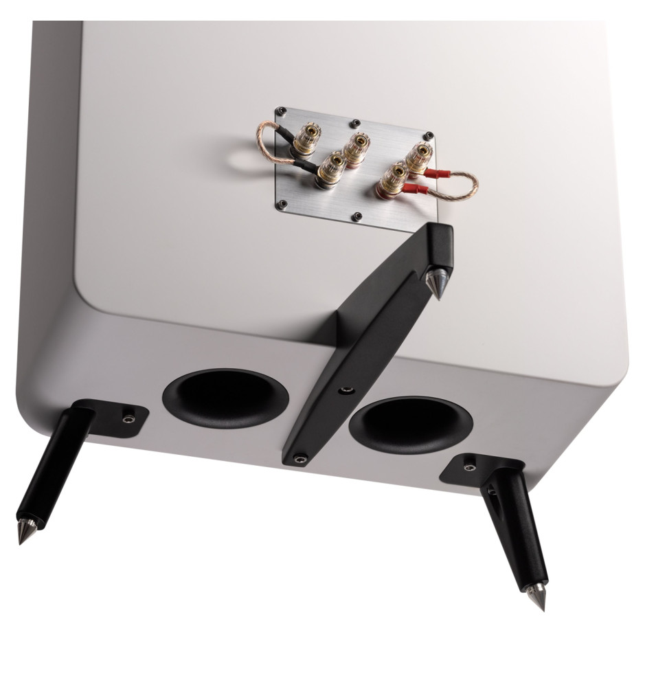 Każdy z przetworników posiada własną, zdejmowaną osłonę, mocowaną za pomocą systemu magnesów. Całkowicie metalowa konstrukcja nóżek z 3-punktowym systemem łożysk gwarantuje idealne rozłożenie ciężaru i absolutną stabilność. Wymienne metalowe kolce oraz dołączone gumowe nóżki pozwalają na dostosowanie podstawy do różnych rodzajów podłogi.