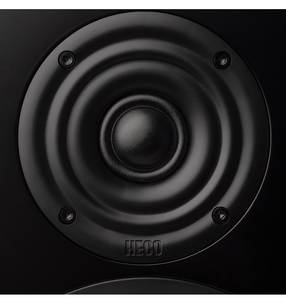 Umieszczone w solidnych stalowych koszach i zabezpieczone pierścieniami przetworniki średnio-niskotonowe wyposażono w charakterystyczne membrany z papieru kraftowego HECO, które gwarantują naturalną reprodukcję dźwięku. Osłony przeciwpyłowe chronią przetworniki, a wysokowydajne cewki drgające gwarantują niskie zniekształcenia. Konstrukcja głośników zapewnia doskonałą odpowiedź basową i poprawia reprodukcję średnich częstotliwości, zapewniając czysty, precyzyjny dźwięk.