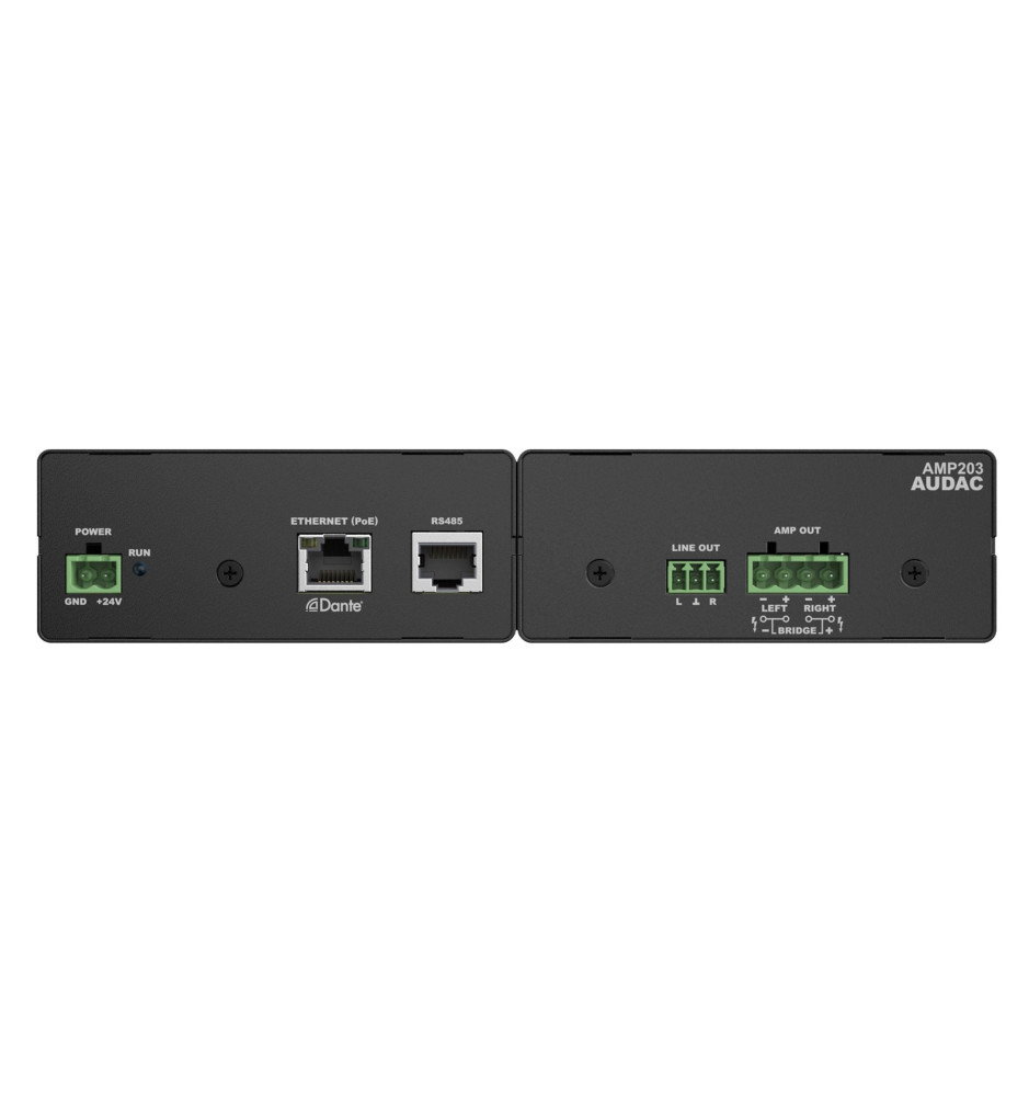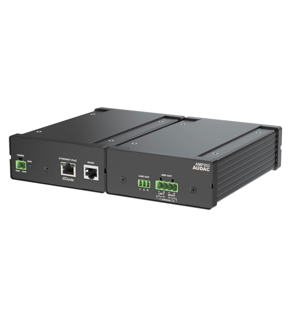 Audac AMP203 to bardzo kompaktowych rozmiarów miniwzmacniacz stereofoniczny, który oferuje szereg funkcji DSP. Umożliwia mu to obsługę wielu różnych konfiguracji kanałów łączności z wykorzystaniem złącz RS485 i Ethernet. 4-pinowe wyjściowe złącze elektryczne pozwala wyprowadzić moc 30 W na kanał lub 60 W po zmostkowaniu. Trójstykowe wyjściowe złącze skręcane umożliwi Ci również połączenie AMP203 z kolejnym wzmacniaczem.