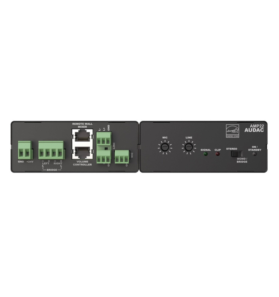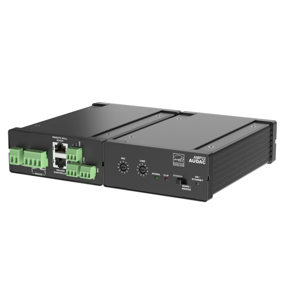 Połączenie zbalansowanej linii stereo z wejściem mikrofonowym sprawia, że Audac AMP22 idealnie nadaje się do zastosowań z wykorzystaniem wraz z ekranem projekcyjnym i źródłami wideo, kiedy podłączony jest mikrofon. Dwa potencjometry wzmocnienia umożliwiają kontrolę czułości i równowagi pomiędzy muzyką i mową, natomiast przełącznik umożliwia mostkowanie kanałów wyjściowych w celu uzyskania jednego kanału o połączonej mocy wyjściowej.