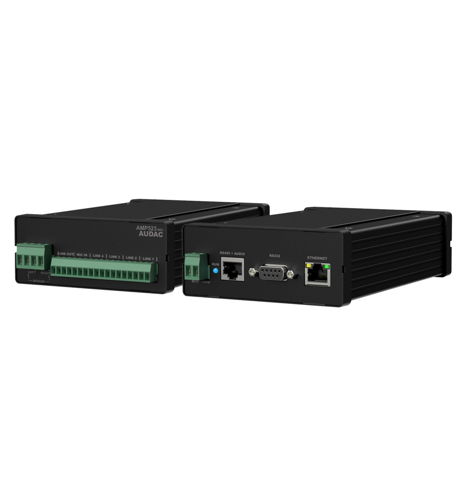 Szeroki wybór wejść liniowych stereo umożliwia jednoczesne podłączenie różnych źródeł dźwięku takich, jak np. laptopy, odtwarzacze CD czy tablety. Możliwe jest także swobodne przełączanie pomiędzy wejściami, regulacja głośności i kontrola pozostałych funkcji za pomocą przeglądarki internetowej umożliwia sterowanie wszystkimi funkcjami z dowolnego komputera z przeglądarką internetową bez konieczności stosowania dodatkowego oprogramowania. Dodatkowe złącze RS232 umożliwia sterowanie Audac AMP523 za pomocą dowolnego urządzenia obsługującym komunikację szeregową, takim jak komputer, a nawet system automatyki domowej lub przemysłowej. Do sterowania systemem za pomocą smartfonu lub tabletu można wykorzystać darmową aplikację producenta Audac Touch.