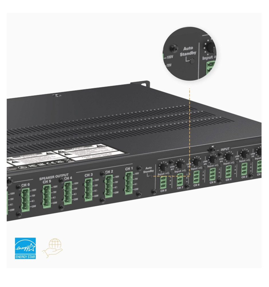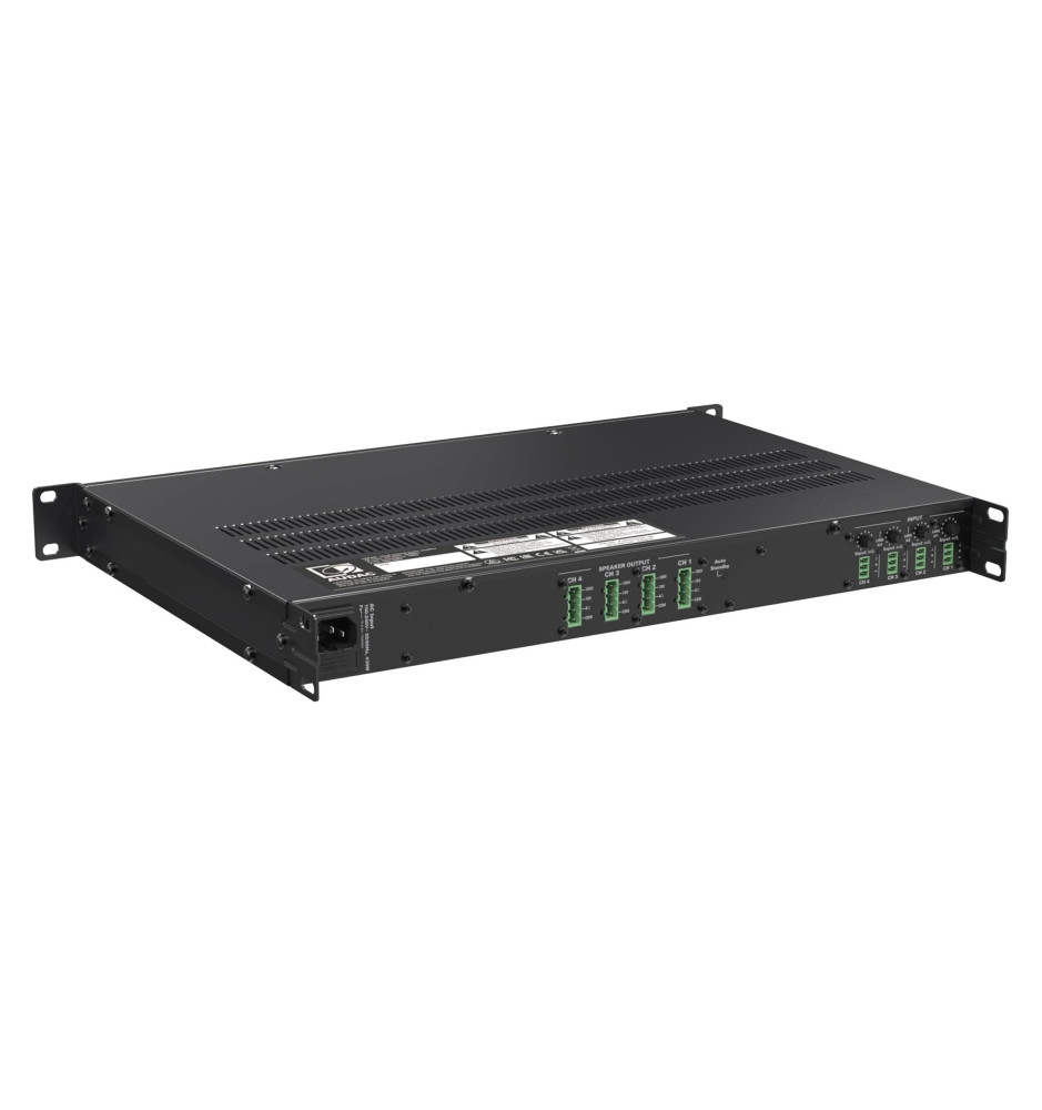 Czterokanałowy wzmacniacz mocy zgodny ze standardem energetycznym Energy Star świadczącym o jego ergonomicznej pracy i niskich kosztach eksploatacji. Zarówno w instalacjach niskoimpedancyjnych, jak i w dystrybucji 70/100V, oferuje on wysokiej jakości wzmocniony sygnał z uwzględnieniem niezależnych stref nagłośnienia, co czyni go doskonałym wyborem w najróżniejszych zastosowaniach.